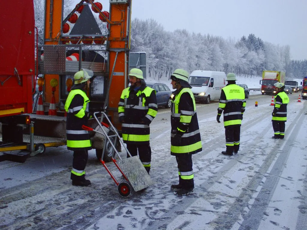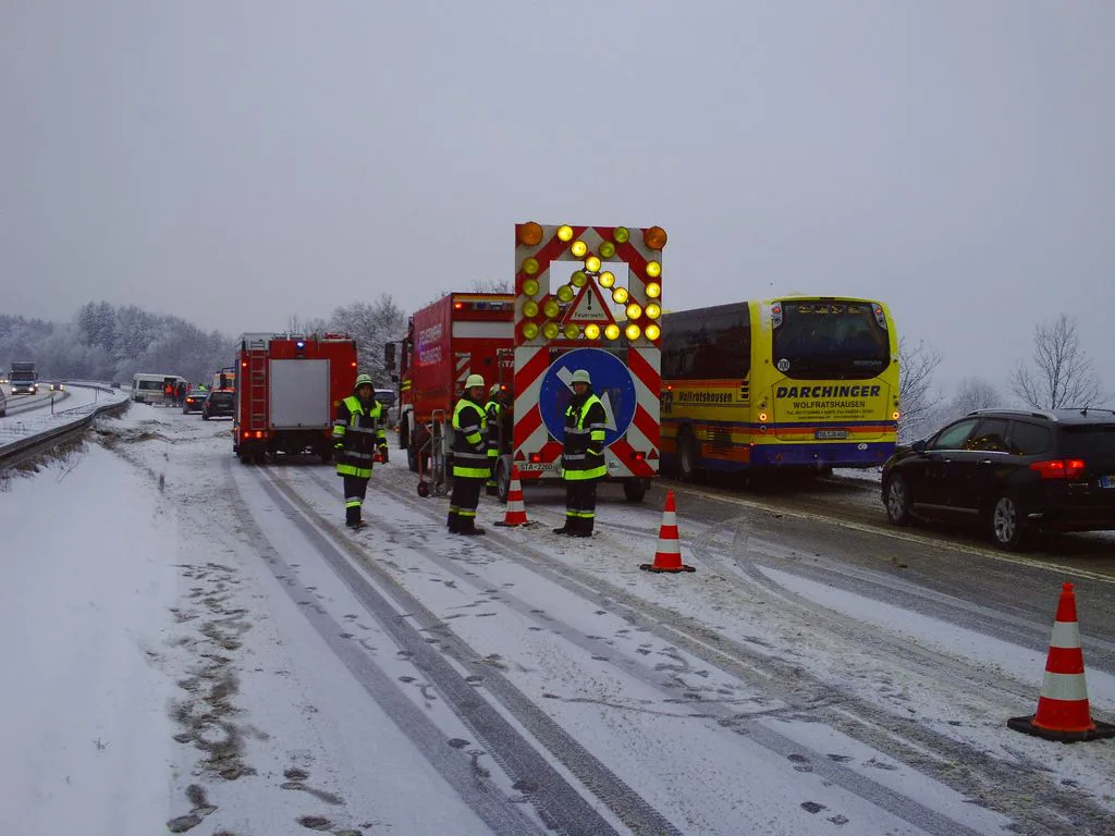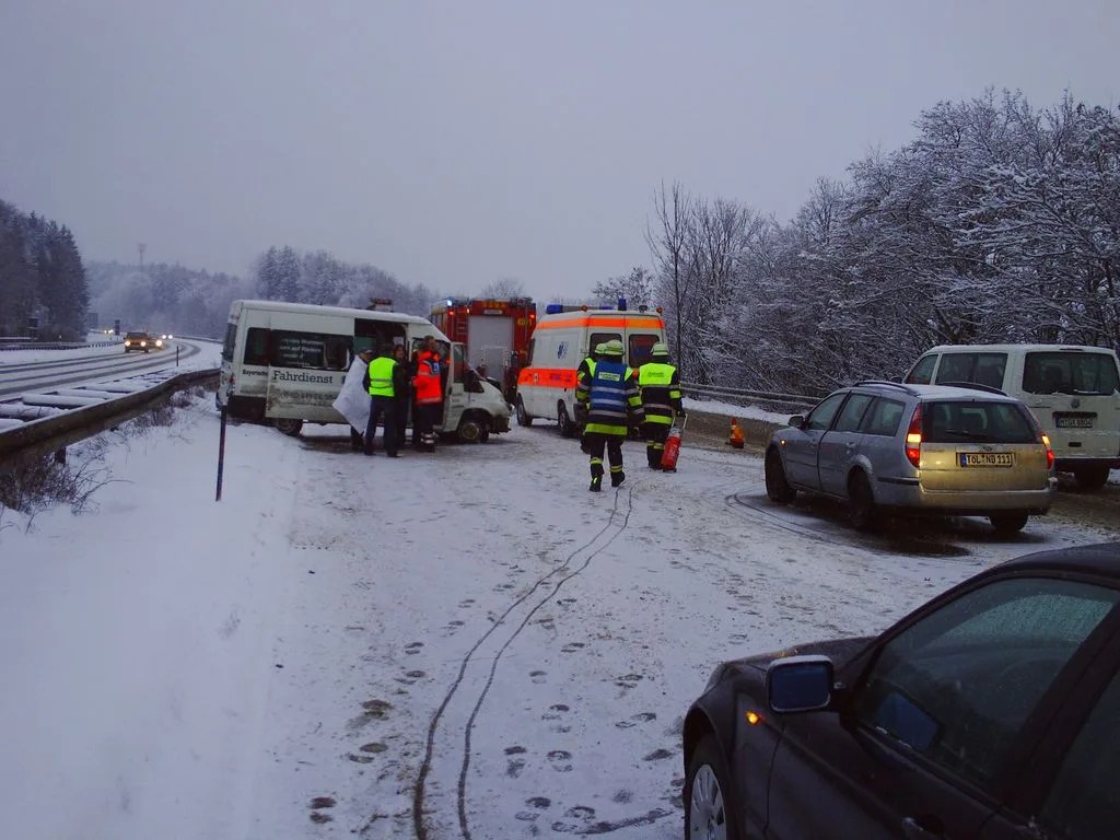 A95 Verkehrsunfall bei Kilometer 12,5. Ein Kleinbus geriet aufgrund der winterlichen Straßenverhältnisse und nicht angepasster Geschwindigkeit ins Schleudern und kollidierte mit der Mittelleitplanke. Insassen bleiben unverletzt. Absicherung der Einsatzstelle.
