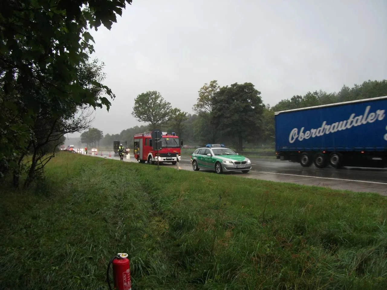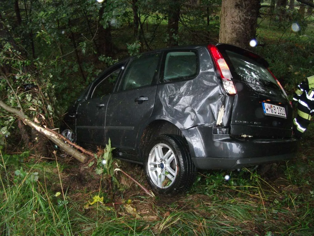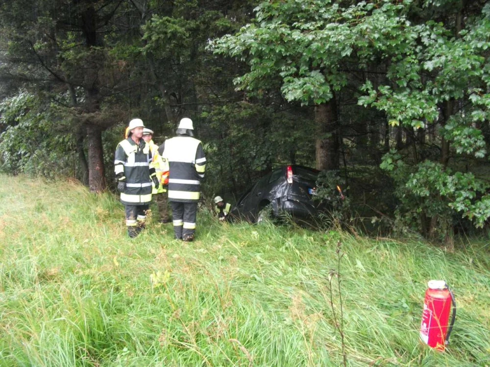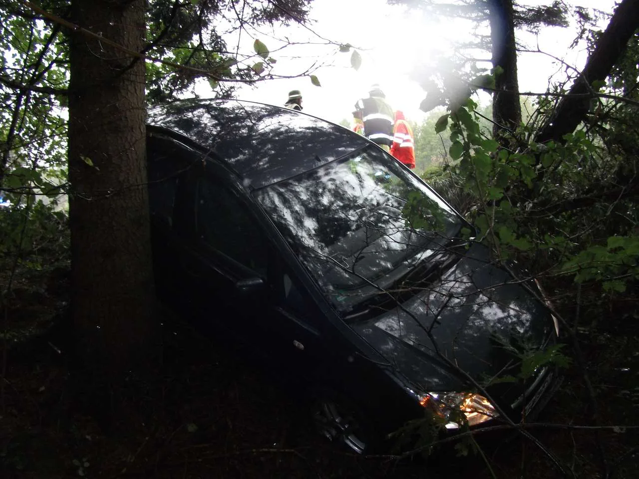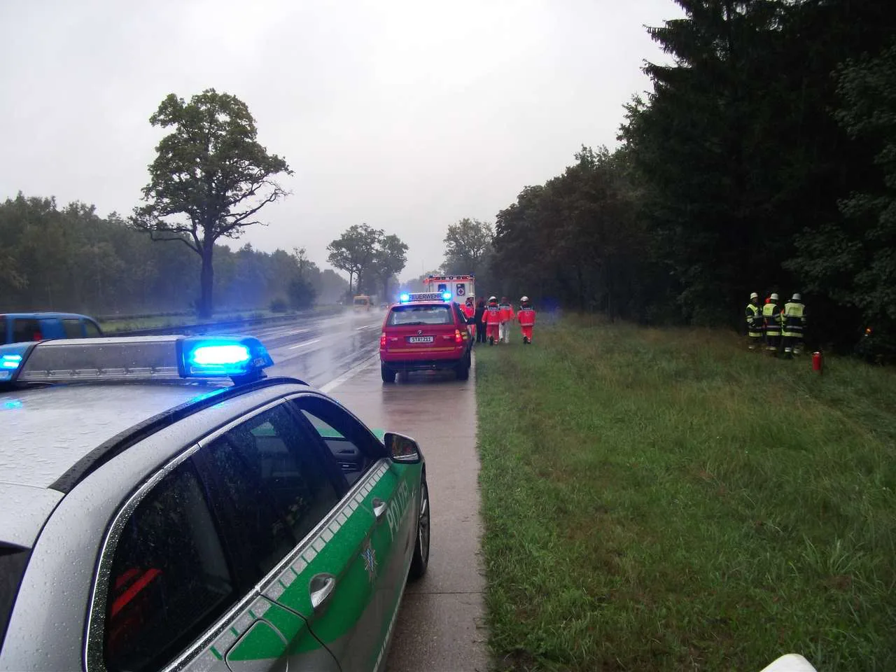 PKW Unfall auf der A95. Eine 24 jährige Münchnerin geriet auf regennasser Fahrbahn ins Schleudern, schleuderte über eine Wiese in eine Baumgruppe und blieb nahezu unverletzt.